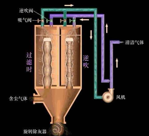 一、過濾式除塵器 袋式除塵器的形式、種類很多,按清灰方式可以分為機(jī)械清灰、逆氣流清灰、脈沖噴吹清灰三類; 按過濾方式可以分為內(nèi)過濾式和外過濾式兩類;按進(jìn)出口的位置不同可分為下進(jìn)風(fēng)和上進(jìn)風(fēng)兩類。 1、袋式除塵器 逆氣流清灰是采用室外或循環(huán)空氣形式與含塵氣流相反的反方向氣流通過濾袋,使其上的塵層脫落,掉入灰斗中。 在這種清灰方式中,一方面是由于反方向的清灰氣流在粉塵層上形成的黏性剝離力直接剝離塵層;另一方面,由于氣流方向的改變,濾袋產(chǎn)生脹縮振動,也有助于塵塊的脫落。